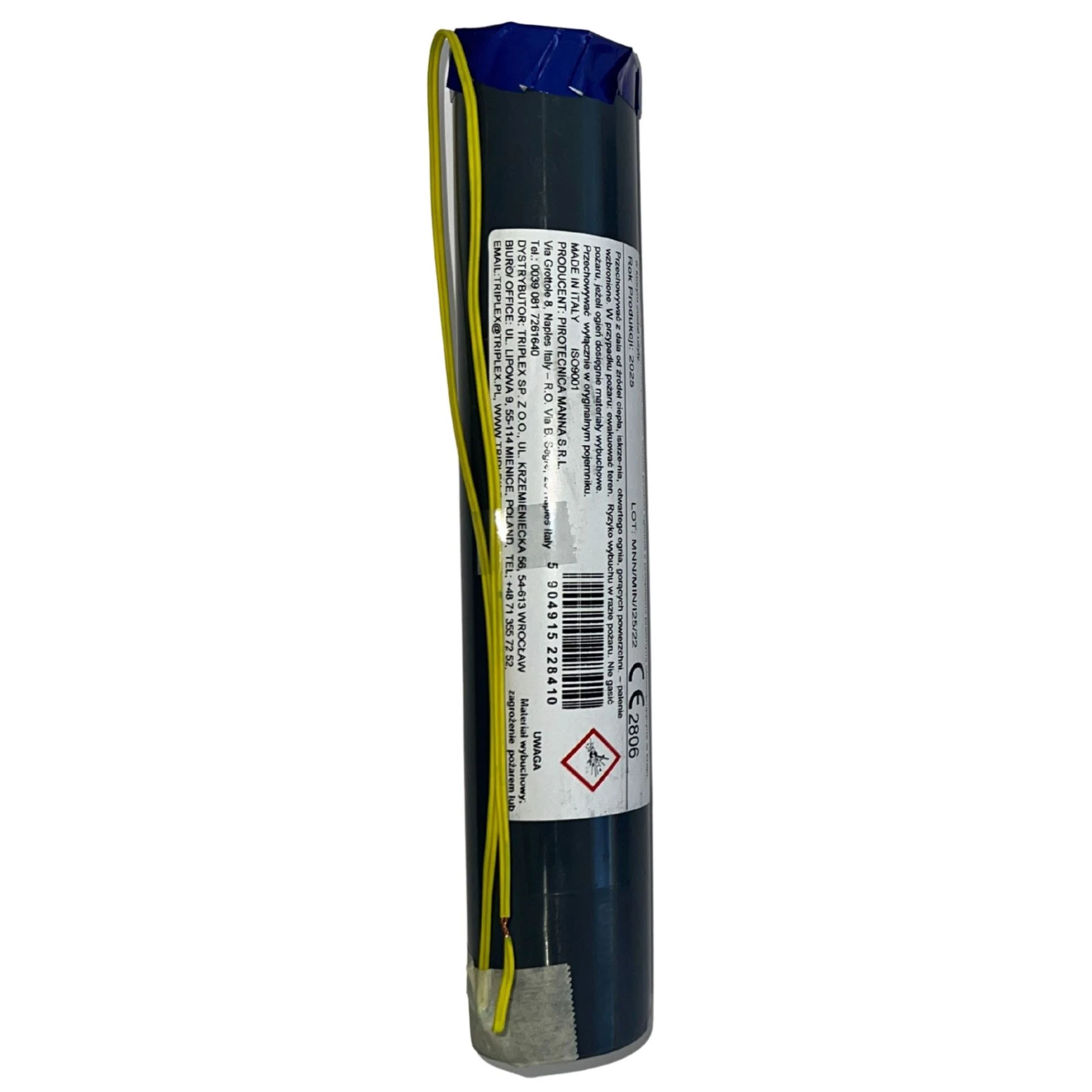 Dýmová mina modrá, denní efekt. Způsob iniciace výrobku je na elektrický odpal palníkem, který je součástí výrobku.