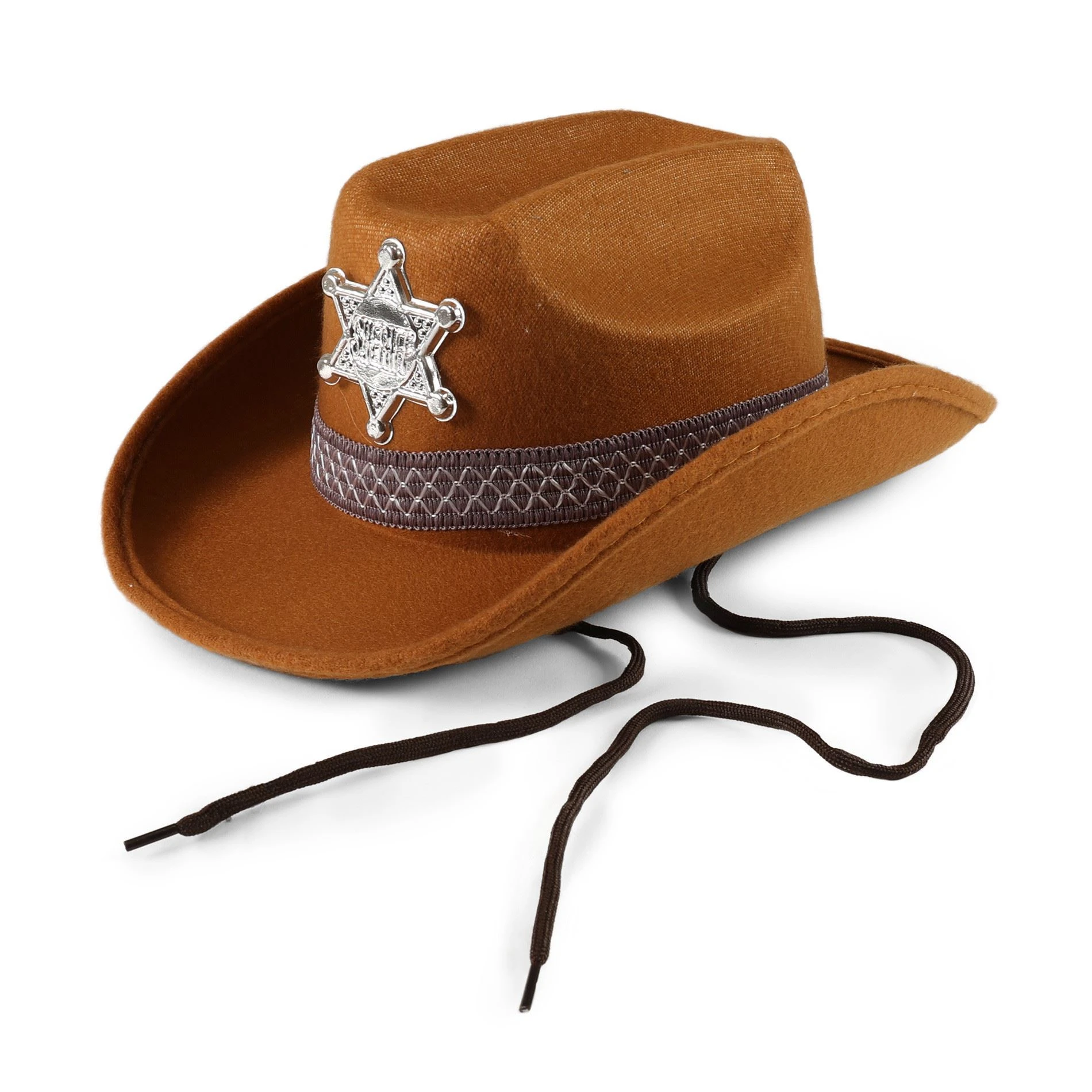 Stylový kovbojský klobouk pro děti! Tento hnědý klobouk na gumičku je navíc zdoben stuhou a šerifskou hvězdou. Nasaď si klobouk a jako šerif budeš mít ve svém městě určitě respekt!