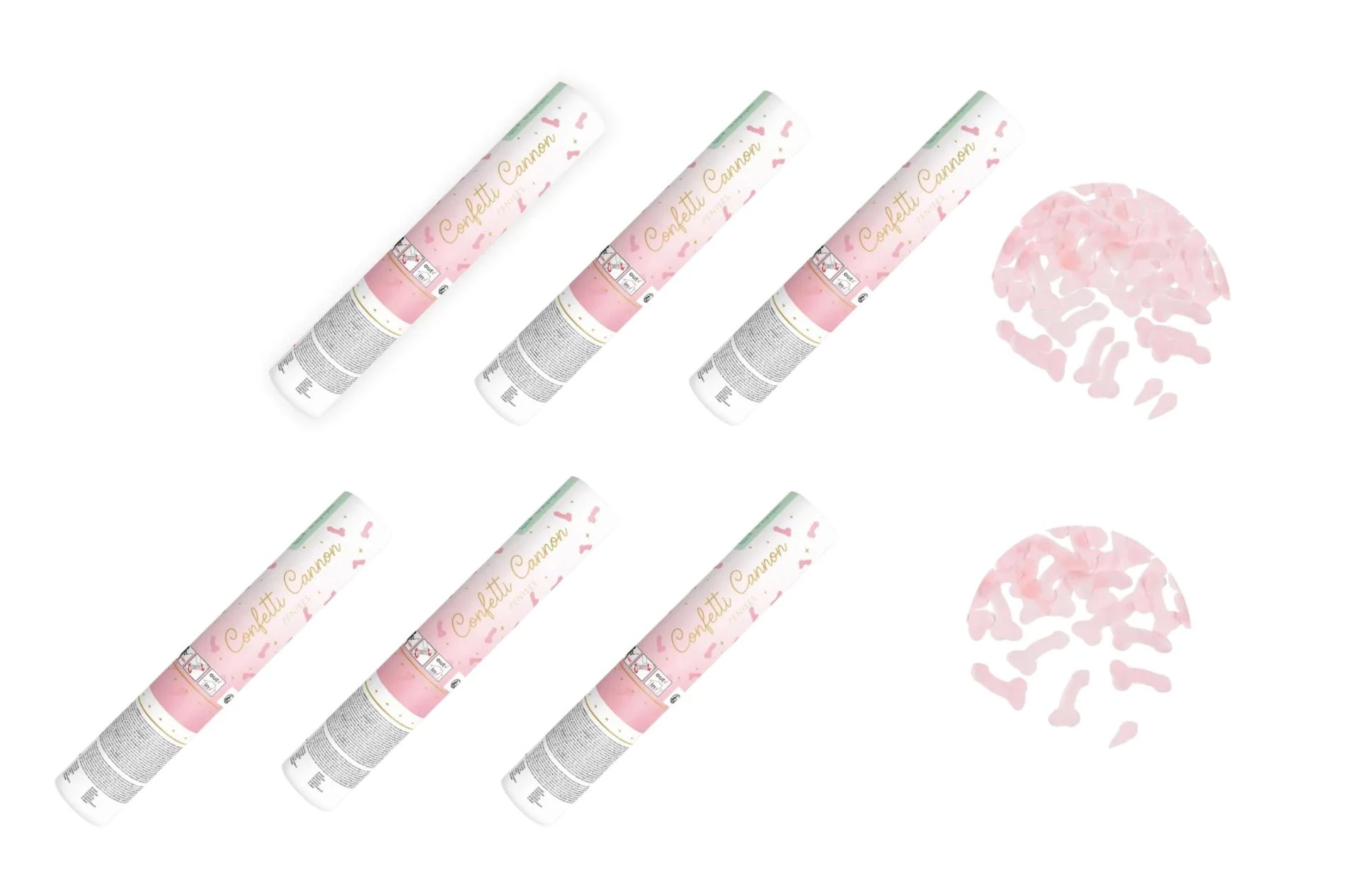 Sada obsahuje: 6 ks konfet o délce 20 cm se světle růžovými papírovými lístky ve tvaru penisů.