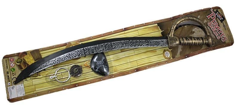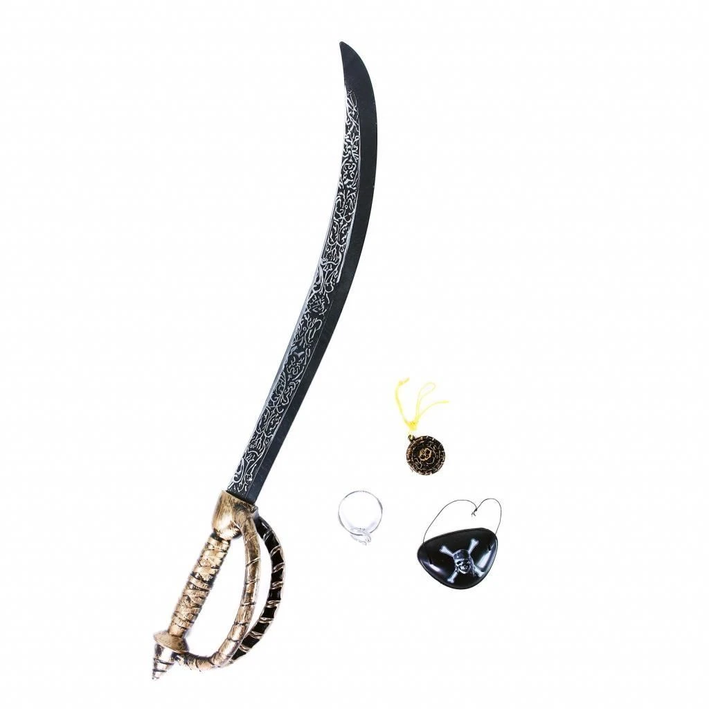 Balení obsahuje vzorovaný meč s úchvatnou rukojetí - délky 65 cm, pirátskou klapku na oči, náhrdelník s motivem lebky a stříbrný kroužek do ucha.